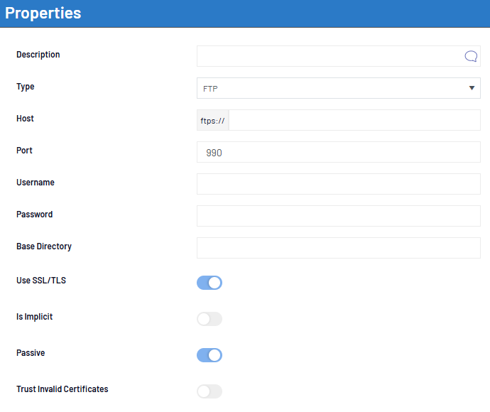 | Is Implicit | Enables implicit mode for FTPS. Only applicable when SSL/TLS is enabled. |