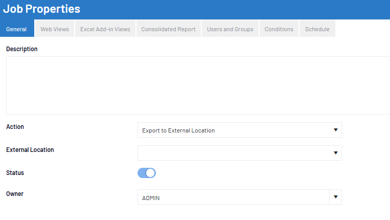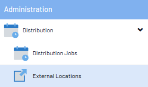 Once saved, the location becomes available for use in Distribution Jobs. In the Job Properties window, select the action Export to External Location from the dropdown menu in the General Tab. You can then select the appropriate location.