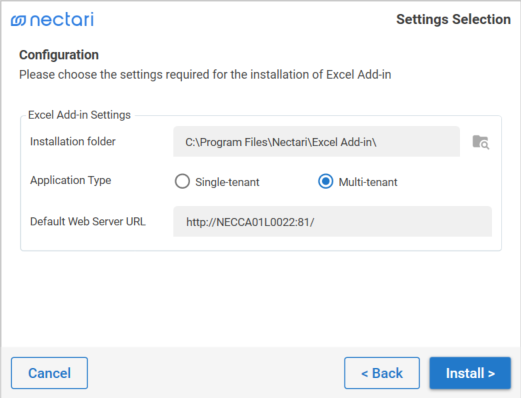 If multi-tenant is selected, enter the default Web Server URL that will be reached by Excel Add-in when connecting to Nectari.