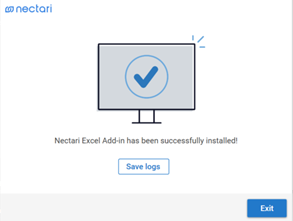 In the Installation screen, wait for Nectari Excel Add-in to be installed and ready for use. This will take a few seconds.