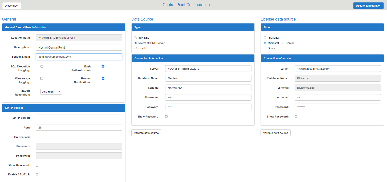 Data Source Two data sources are required for Central Point: the configuration database (installed with the NectariCentral Point for SQL Server and Oracle package), and the license database (installed with the NectariLicense Server package). The name of the license database is invariably BILicense. |