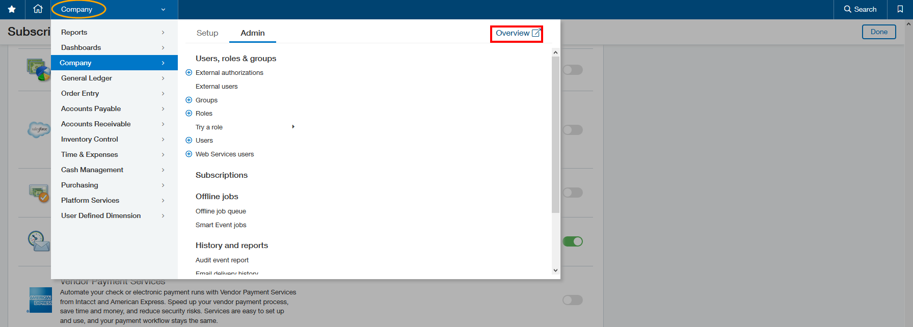 In the upper bar, click the Company category and select Subscriptions located under the Admin tab.