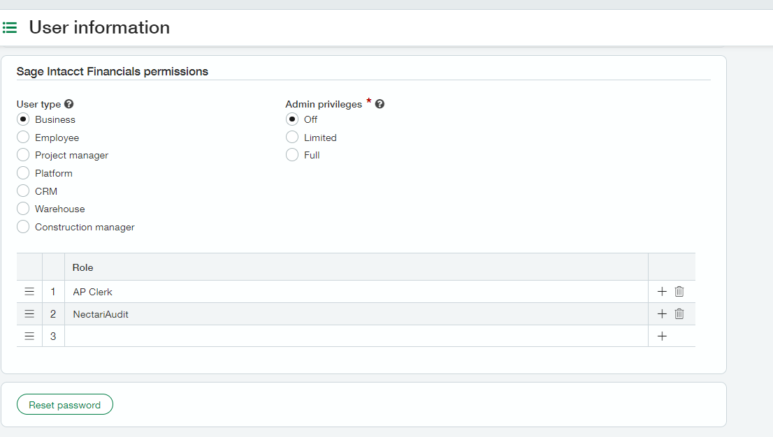 Please note that the Web Services functionality configured in Sage Intacct requires a Web User License for external access. Therefore, a Web User License must be obtained from Sage Intacct to implement with Nectari.