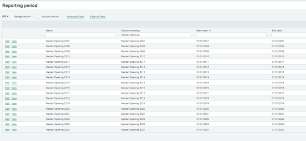 It is strongly recommended that you use the standardized reporting period name "Nectari Opening <YEAR>".