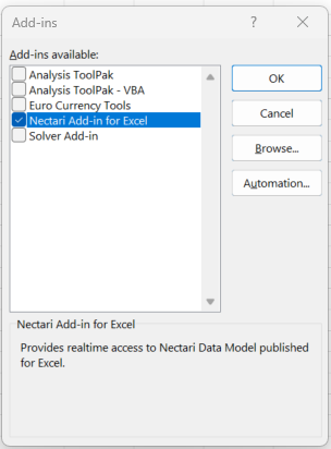 3. Dans la fenêtre Compléments, si le fichier Nectari Add-in for Excel.xla n'est pas présent, cliquez sur Parcourir... et trouvez le fichier dans C:\Program Files\Nectari\Nectari Excel Add-in.