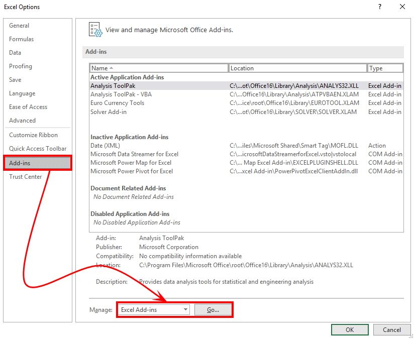 2. Cliquez sur Compléments puis sur Atteindre.. situé à côté de la liste déroulante Gérer.