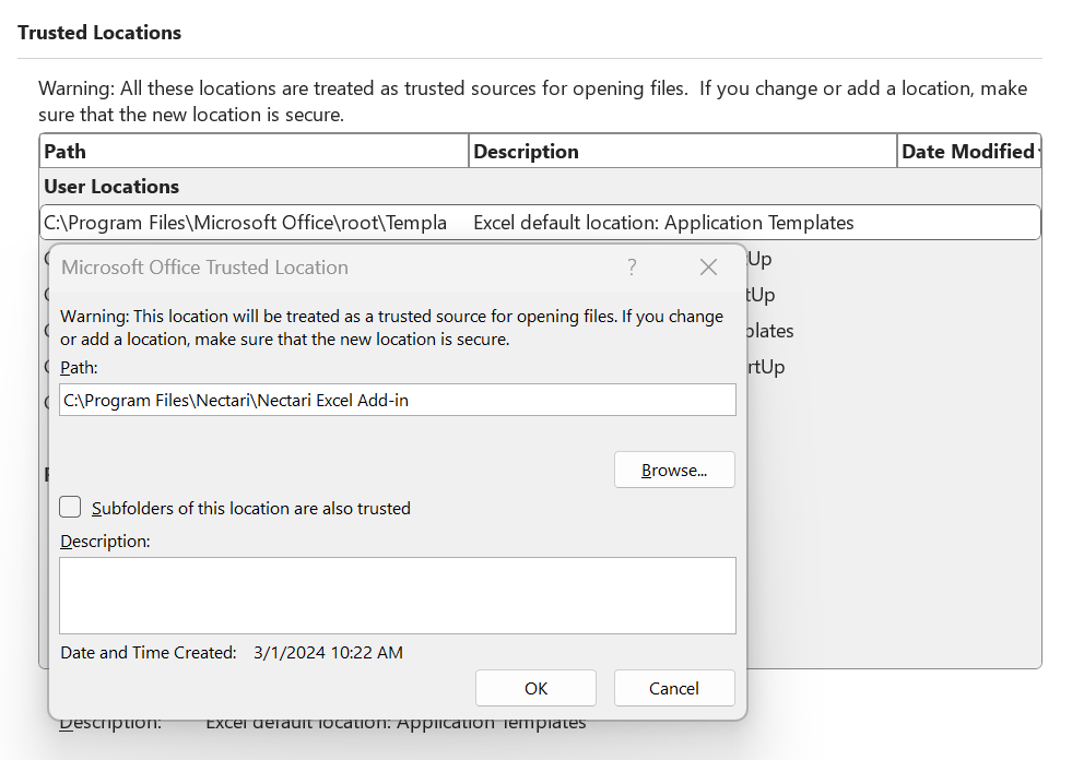 7. Entrez le chemin d'installation C:\Program Files\Nectari\Nectari Excel Add-in et cliquez sur OK 3 fois pour terminer la procédure d'installation.