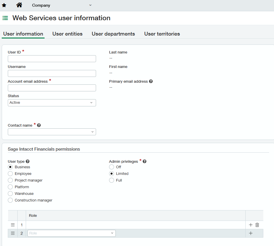 Veuillez noter que la fonctionnalité des services Web configurée dans Sage Intacct nécessite une licence d'utilisateur Web pour l'accès externe. Par conséquent, une licence d'utilisateur Web doit être obtenue auprès d'Intacct pour la mise en œuvre avec Nectari.