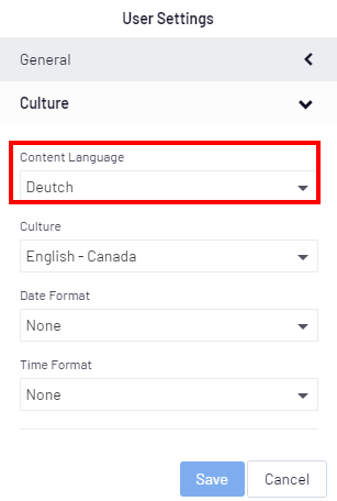 - Revenez à la page d'accueil et changez la langue dans la section Profil de l'utilisateur sous l'onglet Culture pour sélectionner la langue dans laquelle vous venez d'entrer une traduction.Exemple