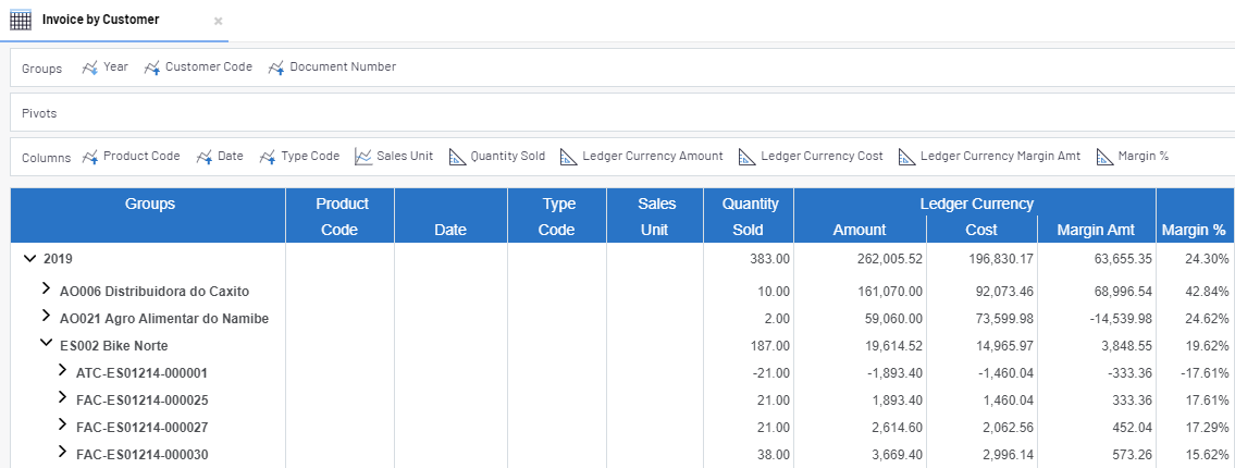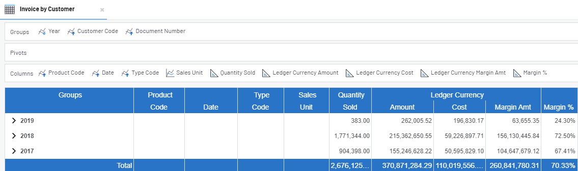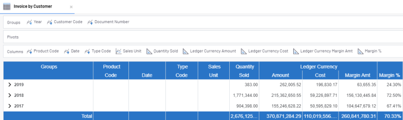 When data is grouped by one or more Fields, users have the ability to expand/drill down (show) or collapse/drill up (hide) the grouped data.