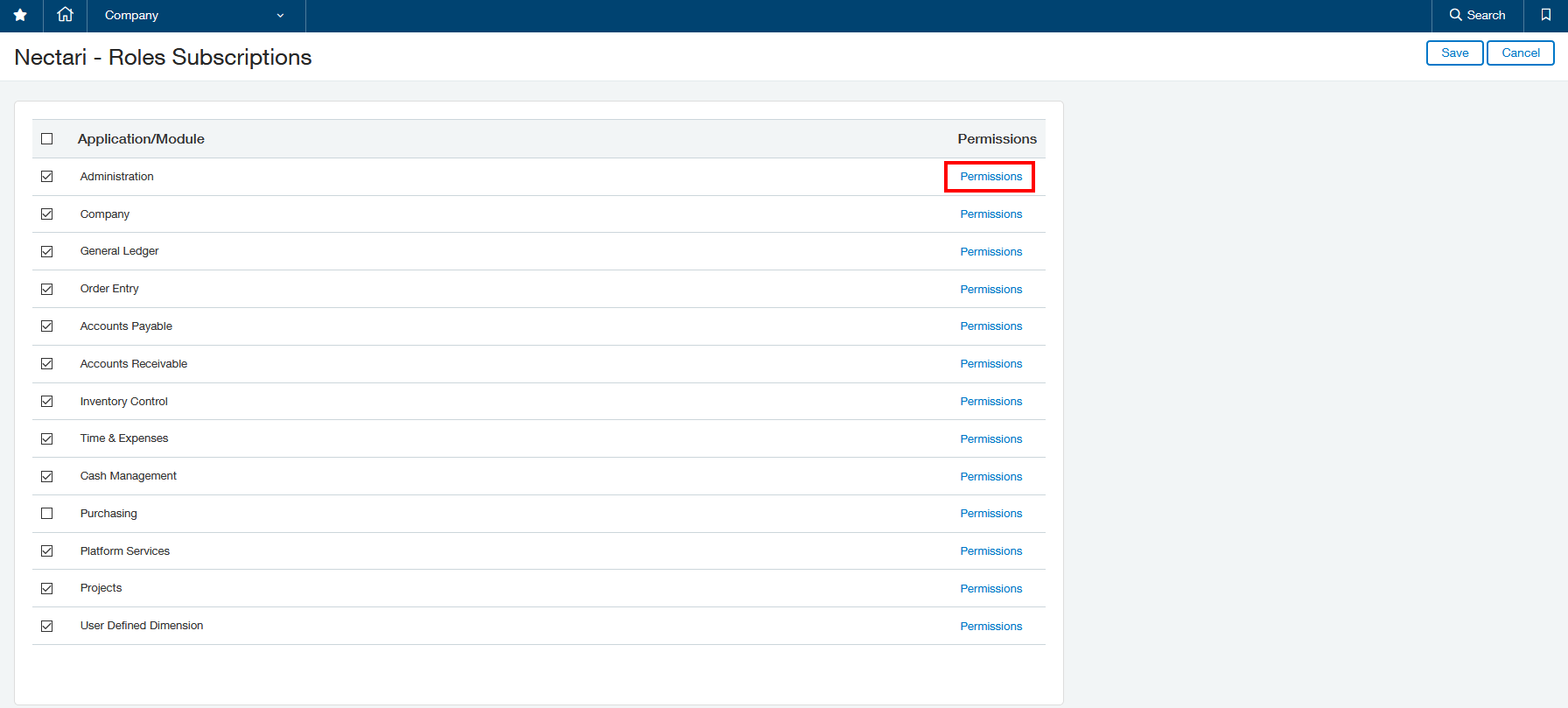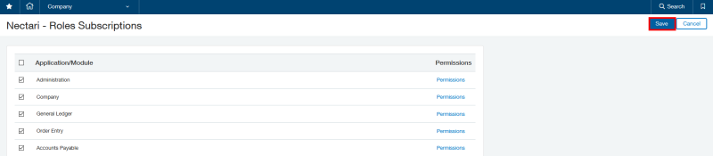 - In the Roles Subscription page, tick the Application / Module checkbox and click on the Permissions hyperlink.