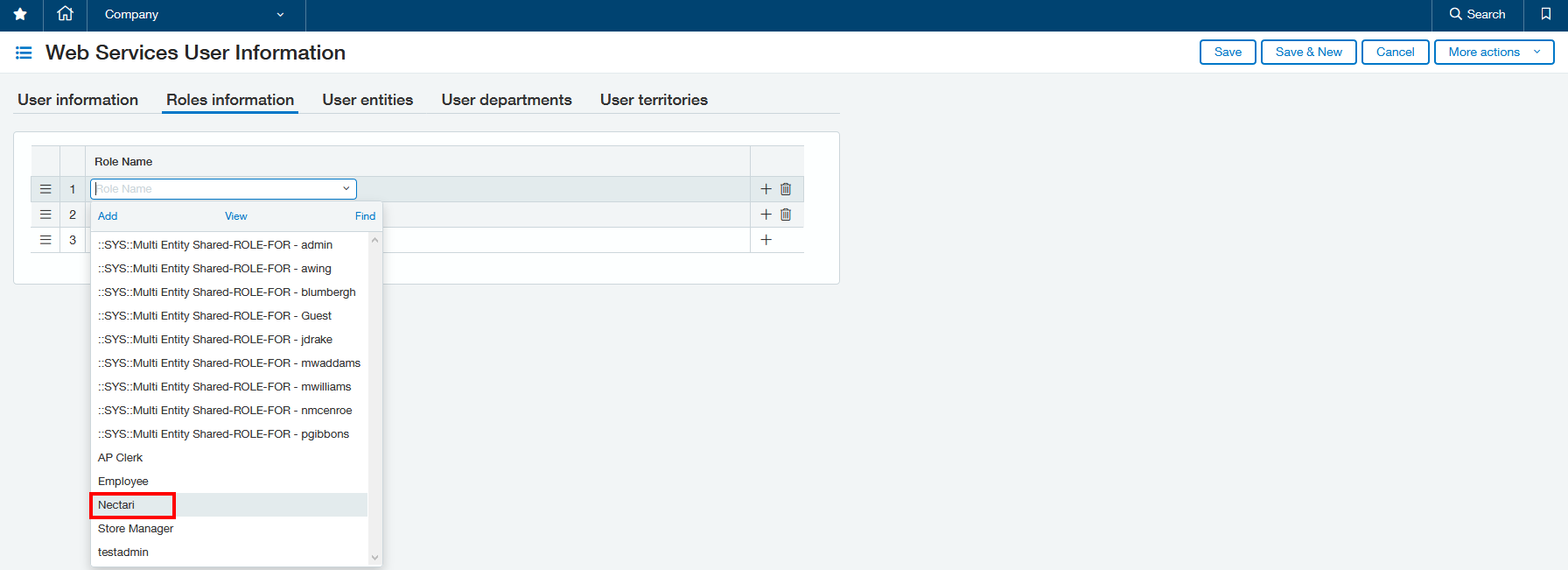 - Click on one of the lines and select Nectari in the Role Name drop-down list.