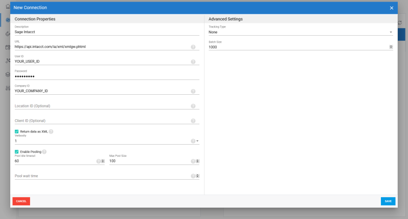 - For the User ID, Password and Company ID fields, enter the credentials you received in the email from Sage Intacct.