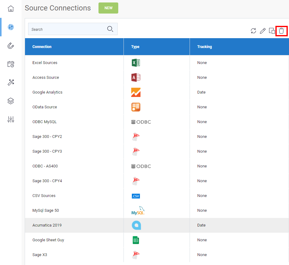 1. Select an existing source or destination connection in the list and click on the trash icon located on the upper right hand corner.