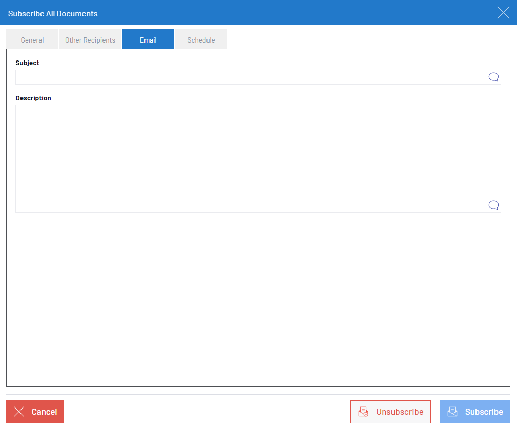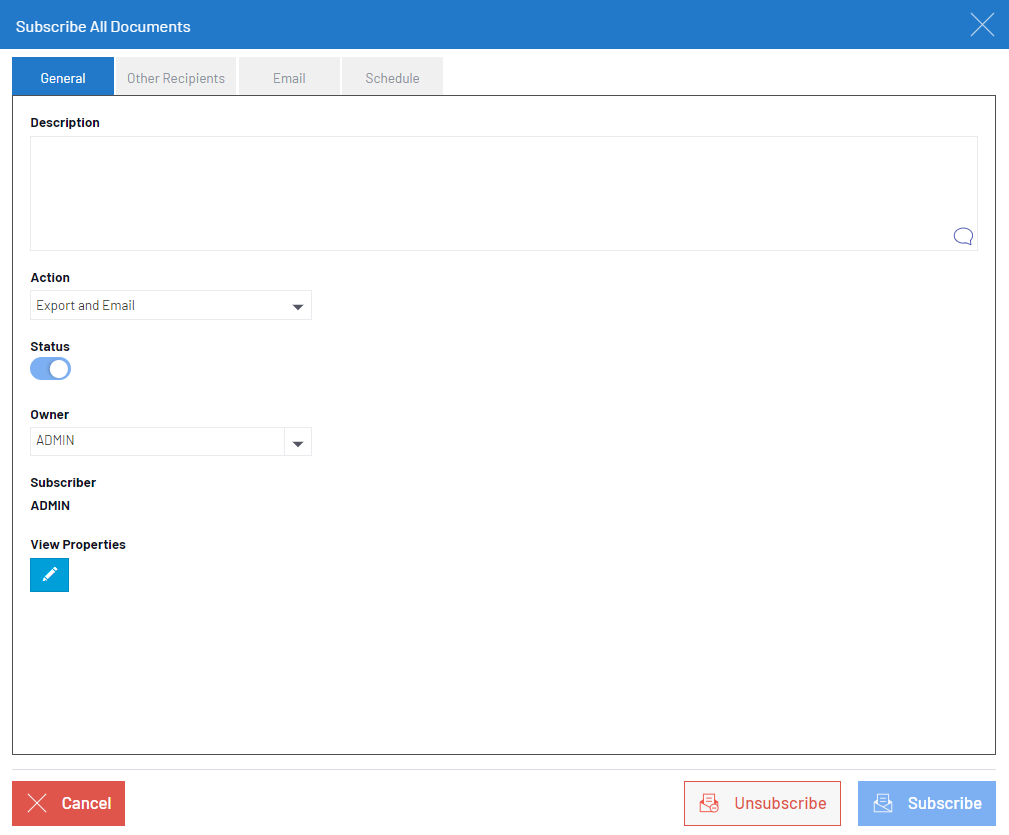 - The Subscribe All Documents dialog box is displayed. Enter the parameters described below in the appropriate tabs (General, Other Recipients, Email, Schedule).